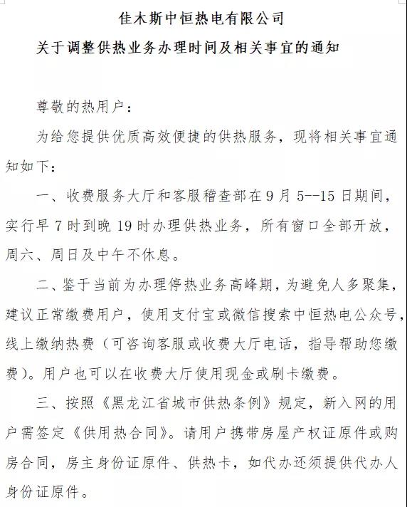★微信“華電能源佳木斯城市供熱”公眾號及工商銀行、建設(shè)銀行各網(wǎng)點。